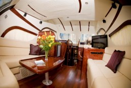 This is an entry level flybridge yacht. Set over three levels, it’s spacious and elegant with a stylish lounge, two comfortable ensuite bedrooms and a large sunbathing deck. The saloon features a fully-equipped galley with microwave, oven and fridge, cleverly blended into the same comfortable area, making a superb entertainment room with all-round views to enjoy. The upper deck has a comfortable seating area and viewing platform.